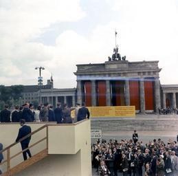 | Keywords: President John F. Kennedy on a platform overlooking the Berlin Wall at the Brandenburg Gate during his visit to West Berlin.jpg KN-C29208 President John F Kennedy on a platform overlooking the Berlin Wall at the Brandenburg Gate during his visit to West Berlin Photograph by Robert Knudsen White House in the John F Kennedy Presidential Library and Museum Boston http //www jfklibrary org/JFK/Media-Gallery/President-and-Mrs-Kennedy-Abroad aspx 1963-06-26 PD-USGov John F Kennedy Presidential Library and Museum |