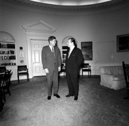 | Keywords: u.s. national archives usnationalarchives jfk presidential library jfkpresidentiallibrary blackandwhite monochrome indoor black and white Original Caption: President John F. Kennedy with Unidentified Visitor We are looking for your help in identifying unknown people in our White House Photographs collection. If you have any information about this photograph, please post a comment, including any relevant sources, for the catalogers at the John F. Kennedy Presidential Library. Thank you! Local Identifier: JFKWHP-ST-302-1-62 Created By: President (1961-1963 : Kennedy). Office of the Naval Aide to the President. (1961 - 1963) From: President (1963-1969 : Johnson). White House Photograph Office. (1963 - 1969) Contact: John F. Kennedy Library (LP-JFK), Columbia Point Boston, MA 02125-3398 Phone: 617-514-1600 Fax: 617-514-1652 Email: kennedy.library@nara.gov Production Dates: 7/3/1962 Scope and Content Note: In this photograph,President John F. Kennedy stands with an unidentified guest (right) in the Oval Office, White House, Washington, D.C. Persistent URL: JFK Library URL: www.jfklibrary.org/Asset-Viewer/Archives/JFKWHP-ST-302-1-... Access Restrictions: Unrestricted Use Restrictions: Unrestricted Original Caption: President John F. Kennedy with Unidentified Visitor We are looking for your help in identifying unknown people in our White House Photographs collection. If you have any information about this photograph, please post a comment, including any relevant sources, for the catalogers at the John F. Kennedy Presidential Library. Thank you! Local Identifier: JFKWHP-ST-302-1-62 Created By: President (1961-1963 : Kennedy). Office of the Naval Aide to the President. (1961 - 1963) From: President (1963-1969 : Johnson). White House Photograph Office. (1963 - 1969) Contact: John F. Kennedy Library (LP-JFK), Columbia Point Boston, MA 02125-3398 Phone: 617-514-1600 Fax: 617-514-1652 Email: kennedy.library@nara.gov Production Dates: 7/3/1962 Scope and Content Note: In this photograph,President John F. Kennedy stands with an unidentified guest (right) in the Oval Office, White House, Washington, D.C. Persistent URL: JFK Library URL: www.jfklibrary.org/Asset-Viewer/Archives/JFKWHP-ST-302-1-... Access Restrictions: Unrestricted Use Restrictions: Unrestricted |