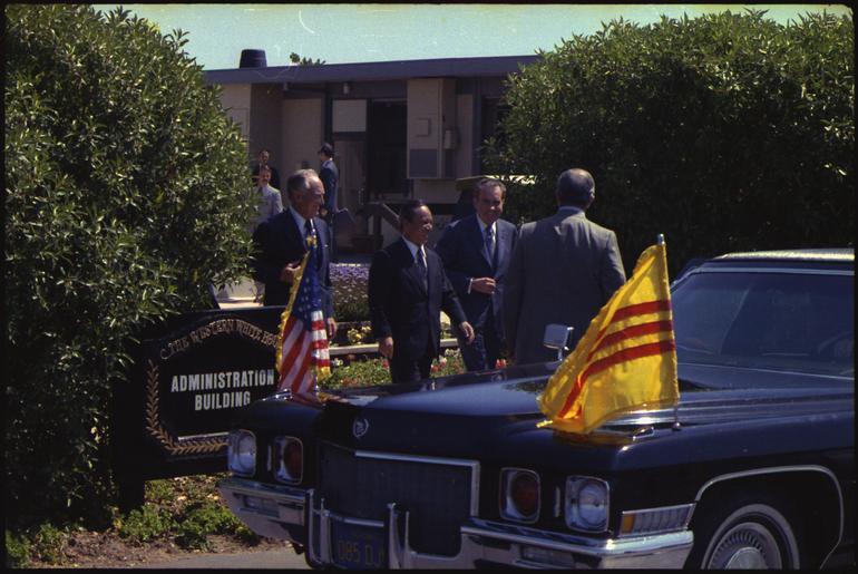 | Keywords: President Nixon escorts Nguyen Van Thieu, President of the Republic of Vietnam, to his car outside the Administrative... - NARA - 194498.tif Scope and content Pictured William P Rogers Nguyen Van Thieu Richard M Nixon Subject Heads of State - S E Asia General notes 194498 Local identifier NLRN-WHPO-E0552-9 General Services Administration National Archives and Records Service Office of Presidential Libraries Office of Presidential Papers 01/20/1969 - ca 12/1974 Most Recent <br /> President 1969-1974 Nixon White House Photo Office 1969 - 1974 Most Recent NARA-Author Atkins Oliver F 1916-1977 Photographer 8451334 <br /> Richard Nixon Library NLRN 18001 Yorba Linda Boulevard Yorba Linda CA 92886 1973-04-02 Record group Collection RN-WHPO White House Photo Office Collection Nixon Administration 01/20/1969 - 08/09/1974 Record group ARC 1179 Nixon White House Photographs compiled 01/20/1969 - 08/09/1974 documenting the period 08/08/1968 - 08/09/1974 Series ARC 194277 File unit File unit ARC Variant control numbers NAIL Control Number NLNP-WHPO-MPF-E0552 9 yes Other versions NARA-cooperation PD-USGov Nguyen Van Thieu Richard Nixon with national leaders Photographs by Ollie Atkins Photographs of flags of South Vietnam Photographs of flags of the United States |