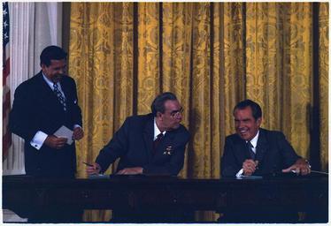 | Keywords: President Nixon and General Secretary Brezhnev signing Scientific and Technical Cooperation Agreement on Peaceful... - NARA - 194522.tif Scope and content Pictured General Secretary Brezhnev President Richard M Nixon Subject Heads of State - U S S R General notes 194522 Local identifier NLRN-WHPO-E1056C-7 General Services Administration National Archives and Records Service Office of Presidential Libraries Office of Presidential Papers 01/20/1969 - ca 12/1974 Most Recent <br /> President 1969-1974 Nixon White House Photo Office 1969 - 1974 Most Recent NARA-Author Atkins Oliver F 1916-1977 Photographer 8451334 <br /> Richard Nixon Library NLRN 18001 Yorba Linda Boulevard Yorba Linda CA 92886 1973-06-21 Record group Collection RN-WHPO White House Photo Office Collection Nixon Administration 01/20/1969 - 08/09/1974 Record group ARC 1179 Nixon White House Photographs compiled 01/20/1969 - 08/09/1974 documenting the period 08/08/1968 - 08/09/1974 Series ARC 194277 File unit File unit ARC Variant control numbers NAIL Control Number NLNP-WHPO-MPF-E1056C 7 yes Other versions NARA-cooperation PD-USGov Arms control treaties Leonid Brezhnev and Richard Nixon Photographs by Ollie Atkins Leonid Brezhnev in 1973 Richard Nixon in 1973 East Room White House |