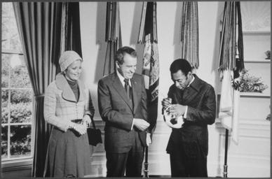 | Keywords: President Nixon meeting with Edson "Pele" Arantes do Nacimento, retired professional Brazilian soccer player and... - NARA - 194508.tif Scope and content Pictured Mrs Edson Arantes do Nacimento President Richard M Nixon Edson Pele Arantes do Nacimento retired Brazilian soccer player Subject Sports General notes 194508 Local identifier NLRN-WHPO-E0765-12A General Services Administration National Archives and Records Service Office of Presidential Libraries Office of Presidential Papers 01/20/1969 - ca 12/1974 Most Recent <br /> President 1969-1974 Nixon White House Photo Office 1969 - 1974 Most Recent NARA-Author Atkins Oliver F 1916-1977 Photographer 8451334 <br /> Richard Nixon Library NLRN 18001 Yorba Linda Boulevard Yorba Linda CA 92886 1973-05-08 Record group Collection RN-WHPO White House Photo Office Collection Nixon Administration 01/20/1969 - 08/09/1974 Record group ARC 1179 Nixon White House Photographs compiled 01/20/1969 - 08/09/1974 documenting the period 08/08/1968 - 08/09/1974 Series ARC 194277 File unit File unit ARC Variant control numbers NAIL Control Number NLNP-WHPO-MPF-E0765 12A yes Other versions NARA-cooperation PD-USGov Photographs by Ollie Atkins |
