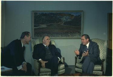 | Keywords: President Nixon meeting with President Pompidou of France and President Eldjarn of Iceland, in Reykjavik, Iceland - NARA - 194512.tif Scope and content Pictured President Kristjan Eldjarn President Georges Pompidou President Nixon Subject Trip to Iceland - Pompidou General notes 194512 Local identifier NLRN-WHPO-E0907C-29A General Services Administration National Archives and Records Service Office of Presidential Libraries Office of Presidential Papers 01/20/1969 - ca 12/1974 Most Recent <br /> President 1969-1974 Nixon White House Photo Office 1969 - 1974 Most Recent NARA-Author Atkins Oliver F 1916-1977 Photographer 8451334 <br /> Richard Nixon Library NLRN 18001 Yorba Linda Boulevard Yorba Linda CA 92886 1973-05-31 Record group Collection RN-WHPO White House Photo Office Collection Nixon Administration 01/20/1969 - 08/09/1974 Record group ARC 1179 Nixon White House Photographs compiled 01/20/1969 - 08/09/1974 documenting the period 08/08/1968 - 08/09/1974 Series ARC 194277 File unit File unit ARC Variant control numbers NAIL Control Number NLNP-WHPO-MPF-E0907C 29A yes Other versions NARA-cooperation PD-USGov Photographs by Ollie Atkins Richard Nixon Georges Pompidou Kristján Eldjárn president |