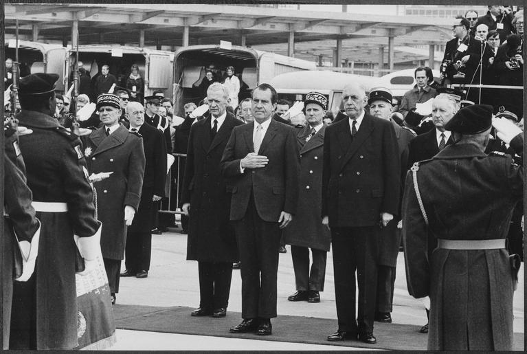 | Keywords: President Nixon's arrival in France - NARA - 194609.tif Scope and content Pictured Richard M Nixon Charles DeGaulle Subject Heads of State - France General notes 194609 Local identifier NLRN-WHPO-0412-04A General Services Administration National Archives and Records Service Office of Presidential Libraries Office of Presidential Papers 01/20/1969 - ca 12/1974 Most Recent <br /> President 1969-1974 Nixon White House Photo Office 1969 - 1974 Most Recent NARA-Author Atkins Oliver F 1916-1977 Photographer 8451334 <br /> Richard Nixon Library NLRN 18001 Yorba Linda Boulevard Yorba Linda CA 92886 1969-03-01 Record group Collection RN-WHPO White House Photo Office Collection Nixon Administration 01/20/1969 - 08/09/1974 Record group ARC 1179 Nixon White House Photographs compiled 01/20/1969 - 08/09/1974 documenting the period 08/08/1968 - 08/09/1974 Series ARC 194277 File unit File unit ARC Variant control numbers NAIL Control Number NLNP-WHPO-MPF-0412 04A yes Other versions NARA-cooperation PD-USGov Photographs by Ollie Atkins |