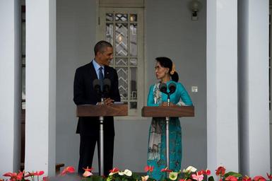 | Keywords: President Obama and Aung San Suu Kyi Address the Media - Flickr - East Asia and Pacific Media Hub (4).jpg RANGOON Burma November 14 2014 President Barack Obama with Chairperson of the National League for Democracy and Member of Parliament Aung San Suu Kyi addresses the international media State Department photo by William Ng/Public Domain https //www flickr com/photos/eapmediahub/15601799577/ President Obama and Aung San Suu Kyi Address the Media 2014-11-14 15 09 https //www flickr com/people/56477391 N06 East Asia and Pacific Media Hub U S Department of State PD-USGov East Asia and Pacific Media Hub https //flickr com/photos/56477391 N06/15601799577 2016-11-27 04 11 07 United States Government Work Files_from_East_Asia_and_Pacific_Media_Hub_U S _Department_of_State_Flickr_stream Barack Obama in Burma 2014 Barack Obama and Aung San Suu Kyi |