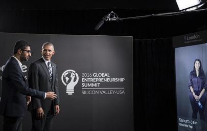 | Keywords: global entrepreneurship summit globalentrepreneurshipsummit ges 2016 ges2016 silicon valley siliconvalley entrepreneurship innovators palo alto paloalto stanford university stanforduniversity california President Obama and Google CEO Sundar Pichai step inside the Google Portal at the seventh annual Global Entrepreneurship Summit (GES) at Stanford University in Palo Alto, California, on June 22-24, 2016. [GES Photo/Public Domain] President Obama and Google CEO Sundar Pichai step inside the Google Portal at the seventh annual Global Entrepreneurship Summit (GES) at Stanford University in Palo Alto, California, on June 22-24, 2016. [GES Photo/Public Domain] |