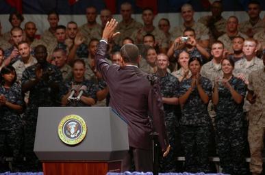 | Keywords: President Obama Visits NATTC DVIDS290481.jpg en President Barack Obama waves to the audience after discussing efforts to contain the oil spill in the Gulf of Mexico with Sailors and Marines at the Naval Air Technical Training Center onboard Naval Air Station Pensacola He also spoke about the role the new Sailors and Marines have in defending America 2010-06-15 Steve Vanderwerff https //www dvidshub net/image/290481 100615-N-+++++-006 2010-06-16 10 40 PENSACOLA FL US PD-USGov-Military-Navy Barack Obama in 2010 Naval Air Station Pensacola Images from DoD uploaded by Fæ |