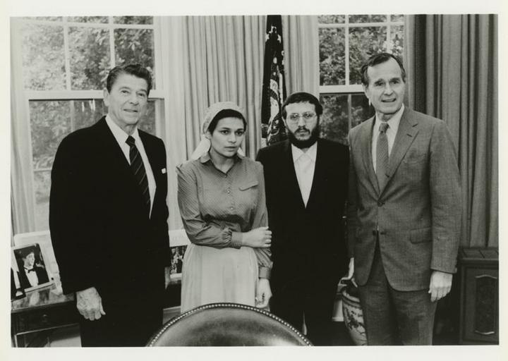 | Keywords: President Ronald Reagan, with Avital Sharansky, Iosif Mendelevich, and Vice-President George H. W. Bush.jpg en Photographer unknown Date undated Medium black and white photograph Repository American Jewish Historical Society Parent Collection National Conference on Soviet Jewry I-181A Link to Digital Object access cjh org/2026880 Call number aa-i181a-b361-f006-004 The photograph was originally found in Box 361 Folder 6 of the Records of National Conference on Soviet Jewry I-181A See more information about this image and the collection by viewing the finding aid Guide to the Records of National Conference on Soviet Jewry Rights Information No known copyright restrictions; may be subject to third party rights For more copyright information click here To inquire about rights and permissions or if you have a question regarding the collection to which the image belongs please contact the Reference Department of the American Jewish Historical Society by email Digital images created by the Gruss Lipper Digital Laboratory at the Center for Jewish History Digitization of select American Soviet Jewry Movement material has been made possible through a generous grant from the National Historical Publications and Records Commission NHPRC 2014-02-10 06 52 50 http //www flickr com/photos/36988361 N08/14767518716/ Center for Jewish History NYC 100px PD-USGov Flickr-no known copyright restrictions Flickr-no known copyright restrictions Uploaded with UploadWizard Files uploaded by Meisam cleanup George H W Bush and Ronald Reagan Natan Sharansky Dissidents from the Soviet Union Yosef Mendelevitch |