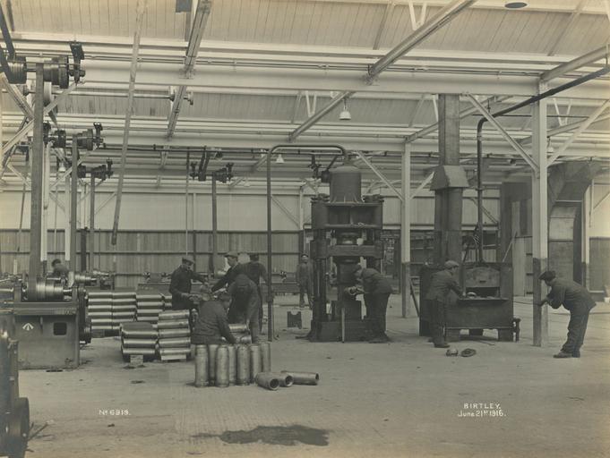 | Keywords: ww1 first world war firstworldwar national projectile factory nationalprojectilefactory birtley birtley belgians birtleybelgians social history socialhistory sir w.g. armstrong whitworth & co. ltd sirwgarmstrongwhitworthcoltd shell manufacture shellmanufacture elisabethville machinery gun shells gunshells blackandwhite black and white Pressing the copper band on the shell at the National Projectile Factory, Birtley, 21 June 1916 (TWAM ref. 1027/271). These images belong to an album of photographs taken in the National Projectile Factory, Birtley (near Gateshead) during the First World War. The photographs were taken by Sir W.G. Armstrong Whitworth & Co Ltd, who built the factory. The images date from June 1916, shortly after the factory became operational. What makes the factory (and these photographs of it) so special is that all the management and workers there were Belgian. The factory and the nearby village of Elisabethville (built to accommodate them) were like a little corner of Belgium transplanted to the North East of England. More information about the factory and the village of Elisabethville can be found in the blog, which accompanies this set. (Copyright) We're happy for you to share these digital images within the spirit of The Commons. Please cite 'Tyne & Wear Archives & Museums' when reusing. Certain restrictions on high quality reproductions and commercial use of the original physical version apply though; if you're unsure please email archives@twmuseums.org.uk Pressing the copper band on the shell at the National Projectile Factory, Birtley, 21 June 1916 (TWAM ref. 1027/271). These images belong to an album of photographs taken in the National Projectile Factory, Birtley (near Gateshead) during the First World War. The photographs were taken by Sir W.G. Armstrong Whitworth & Co Ltd, who built the factory. The images date from June 1916, shortly after the factory became operational. What makes the factory (and these photographs of it) so special is that all the management and workers there were Belgian. The factory and the nearby village of Elisabethville (built to accommodate them) were like a little corner of Belgium transplanted to the North East of England. More information about the factory and the village of Elisabethville can be found in the blog, which accompanies this set. (Copyright) We're happy for you to share these digital images within the spirit of The Commons. Please cite 'Tyne & Wear Archives & Museums' when reusing. Certain restrictions on high quality reproductions and commercial use of the original physical version apply though; if you're unsure please email archives@twmuseums.org.uk |