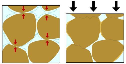 | Keywords: Pressure solution sandstone.svg en Schematic diagram of pressure solution accommodating compression/compaction in a clastic rock Left box shows the situation before compaction Blue arrows indicate the flow of particles in solution Red arrows indicate areas of maximum stress grain contacts Right box shows the situation after compaction In light coloured areas new mineral growth has reduced pore space own Woudloper 2009-04 Sedimentology diagrams Petrology diagrams Diagrams of sedimentary rocks Sandstone |