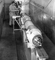 | Keywords: blackandwhite monochrome black and white (A-24639.6): The interior of the PBR’s gun room showing the breach end of the 0.50-caliber, deformable-piston, light-gas gun used to propel models through the tank. (A-24639.6): The interior of the PBR’s gun room showing the breach end of the 0.50-caliber, deformable-piston, light-gas gun used to propel models through the tank. |