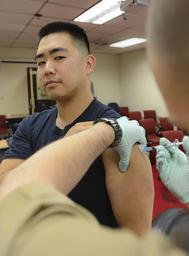| Keywords: Preventive medicine operation 130927-N-TB410-273.jpg en Hospital Corpsman 1st Class Charles Wilton Commander U S Naval Forces Korea CNFK medical liaison administers a typhoid vaccine to Lt Jonathan Park Sept 27 during a preventive medicine operation on U S Army Garrison Yongsan in Seoul The event provided many sailors and Marines in the Seoul area a quick one-stop opportunity to maintain their medical readiness and receive any needed vaccines U S Navy Photo by MC1 Joshua Bryce Bruns / Released 2013-09-27 Petty Officer 1st Class Joshua Bruns https //www dvidshub net/image/1148764 130927-N-TB410-273 2014-01-10 08 03 SEOUL KR PD-USGov-Military-Navy Yongsan Garrison Images from DoD uploaded by Fæ |