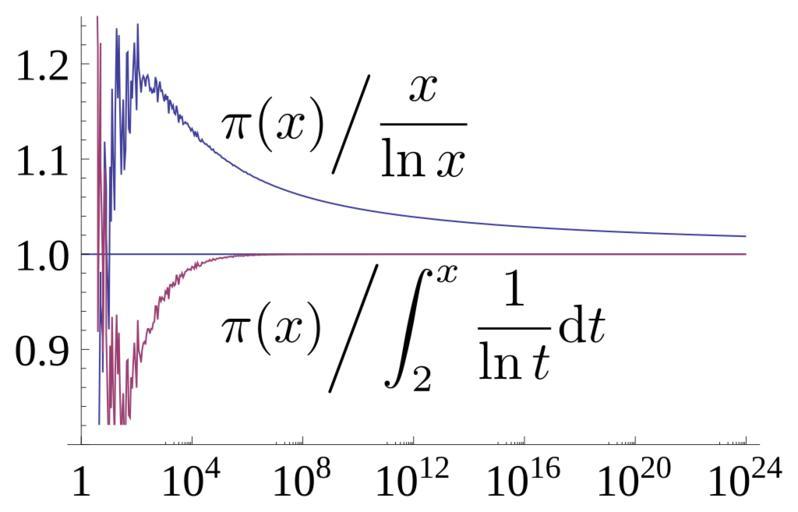 | Keywords: Prime number theorem ratio convergence.svg en A plot showing how two estimates described by the prime number theorem <math>\frac x \ln x </math> and <math>\int_2 x \frac 1 \ln t \mathrm d t Li x li x - li 2 </math> converge asymptotically towards <math>\pi x </math> the number of primes less than x The x axis is <math>x</math> and is logarithmic labelled in evenly spaced powers of 10 going up to 10<sup>24</sup> the largest <math>x</math> for which <math>\pi x </math> is currently known The former estimate converges extremely slowly while the latter has visually converged on this plot by 10<sup>8</sup> Source used to generate this chart is shown below own User Dcoetzee 2013-03-21 Prime numbers Cc-zero Source All source released under CC0 waiver Mathematica source to generate graph which was then saved as SVG from Mathematica <pre> Sample both functions at 600 logarithmically spaced points between \ 1 and 2 40 base NE 24 Log10/600 ; ratios Table Roundbase x NPrimePiRoundbase x/ base x/ x Logbase x 1 Floor40/Log2 base ; ratiosli Table Roundbase x NPrimePi Roundbase x/ LogIntegralbase x - LogIntegral2 x CeilingLogbase 2 Floor40/Log2 base ; Supplement with larger known PrimePi values that are too large for \ Mathematica to compute LargePiPrime 10 13 346065536839 10 14 3204941750802 10 15 29844570422669 10 16 279238341033925 10 17 2623557157654233 10 18 24739954287740860 10 19 234057667276344607 10 20 2220819602560918840 10 21 21127269486018731928 10 22 201467286689315906290 10 23 1925320391606803968923 10 24 18435599767349200867866 ; ratios2 Joinratios Map 1 N 2/ 1/ Log 1 LargePiPrime; ratiosli2 Joinratiosli Map 1 N 2/ LogIntegral 1 - LogIntegral2 LargePiPrime; Plot with log x axis together with the horizontal line y 1 ShowLogLinearPlot1 x 1 10 24 PlotRange -> 0 8 1 25 ListLogLinearPlot ratios2 ratiosli2 Joined -> True LabelStyle -> FontSize -> 14 </pre> LaTeX source for labels <pre> \left \pi x \middle/ \frac x \ln x \right \left \pi x \middle/ \int_2 x \frac 1 \ln t \mathrm d t \right </pre> These were converted to SVG with http //www tlhiv org/ltxpreview/ and then the graph was embedded into the resulting document in Inkscape Axis fonts were also converted to Liberation Serif in Inkscape |