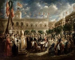 | Keywords: Primera piedra del Monumento a San Fernando.jpg La escena representa el acto de la colocación de la primera piedra del monumento a San Fernando en la ciudad de Sevilla que tuvo lugar en marzo de 1877 En primer plano aparecen y a la derecha los duques de Montpensier con sus hijas y al fondo la reina Isabel II de España con sus hijas las infantas Y junto a la mesa en la que el rey Alfonso XII de España firma el documento aparecen el alcalde José María Ybarra Gutiérrez de Caviedes conde de Ybarra Francisco de Borja Queipo de Llano conde de Toreno el presidente del Gobierno Antonio Cánovas del Castillo el capitán general Fernando Primo de Rivera Manuel Silvela el jefe de la oposición y un prelado 1877 oil canvas Size cm 190 153 Institution Casa consistorial de Sevilla Salón Santo Tomás http //patrimoniumhispalense com/es/espacio/casa-consistorial/alfonso-xii-firmando-el-acta-de-colocacion-de-la-primera-piedra-del-monumento-a-san-fernando object history exhibition history credit line accession number http //patrimoniumhispalense com/es/espacio/casa-consistorial/alfonso-xii-firmando-el-acta-de-colocacion-de-la-primera-piedra-del-monumento-a-san-fernando PD-old-100 Uploaded with UploadWizard Paintings in the Town hall of Seville Paintings of Alfonso XII of Spain Historical images of Seville José María Romero López 1877 in Andalusia |