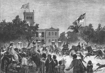 | Keywords: Prince Henry of Prussia visiting Hawaii in 1879.jpg en Prince Henry of Prussia visits Hawaii in 1879 as sketched by C Salzmann in Niklaus R Schweizer Hawai'i and the German Speaking Peoples Honolulu Topgallant P 1982 http //hdl handle net/10524/539 Hawaiian Journal of History page 113 of volume 25 1991 article King Kalakaua An International Perspective by Niklaus R Schweizer credited to George Bacon photo ~ 1879 PD-old Aliiolani Hale 1879 in Hawaii Prince Heinrich of Prussia 1879 photographs |