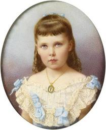 | Keywords: Princess Victoria Melita of Edinburgh and Saxe-Coburg and Gotha as a young girl.png Princess Victoria Melita of Edinburgh and Saxe-Coburg and Gotha Princess Victoria Melita ˜Ducky ™ is shown aged four and a half wearing a pale-blue dress trimmed with lace and blue ribbons and a pendant with the interlaced initials VR around her neck on a gold chain Commissioned by Queen Victoria in 1881 1881 420521 Eduardo de Moira 1817 “87 other versions Princess Victoria Melita of Edinburgh and Saxe-Coburg and Gotha as a young girl jpg PD-old-auto-1923 1887 Princess Victoria Melita of Edinburgh and Saxe-Coburg and Gotha Watercolours in the Royal Collection of the United Kingdom Ras67's restorations Round portraits |