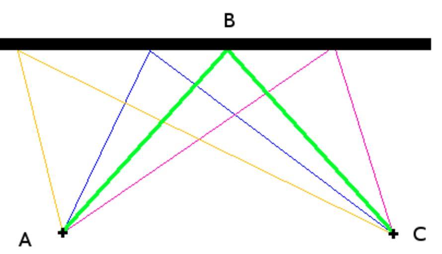 Keywords: Principe du plus court chemin.png droite est obtenu lorsque l'angle d'incidence est égal à l'angle réfléchi sur la figure il s'agit du chemin vert own PerOX 2009-01 Reflection diagrams Calculus of variations