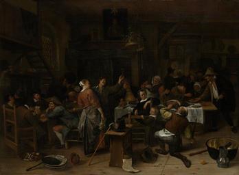 Keywords: Prinsjesdag Rijksmuseum SK-A-384.jpeg Artwork creator Jan Steen bedstede hangs a portrait of the prince Above the table hangs a copper chandelier with a orange twig and a bell Prinsjesdag Herberginterieur met een gezelschap die de geboorte van prins Willem III op 14 november 1650 viert Aan tafel zitten mensen te drinken te eten en te lachen Links leest een man iets voor uit een papier Aan de muur boven een bedstee hangt een schilderij met het portret van de prins Boven de tafel een koperen kroon met een oranjetak en een bel between 1660 1679 Ucfirst Oil on panel cm 46 62 5 Institution Rijksmuseum Amsterdam LangSwitch Gallery of Honour Eregalerij place of discovery object history by 1870 Leendert Dupper Wzn 1799-1870 Dordrecht ProvenanceEvent 1870 bequest LangSwitch das the au het Rijksmuseum Amsterdam Amsterdam Leendert Dupper Wzn Dordrecht exhibition history Jan Steen 1958-1959 15 credit line LangSwitch On a piece of paper Op een stuk papier ~ Op de gesonheyt van het nasauss basie in de eene hant het rapier in de andere hant het glasie odt To the health of the Nassau laddy in one hand the rapier sword in the other hand the glass bottom center Salus patriae suprema lex esto The good of the country must be the supreme law top center Wij screuwe als leuwe We roar like lions top center accession number SK-A-384 place of creation Haarlem i18n/or Leiden www rijksmuseum nl http //www rijksmuseum nl Home http //www rijksmuseum nl/collectie/SK-A-384 Info Prince's Day by Jan Steen jpg Amsterdam - Rijksmuseum 1885 - The Gallery of Honour 1st Floor - A company celebrating the birthday of Prince William III 14 November 1650 1650-79 by Jan Steen jpg Version with frame Anonymous SK-A-384 LangSwitch Prince's Day Prinsjesdag 1660-1679 Anonymous 6380 LangSwitch A company celebrating the birthday of Prince William III on 14th November 1660 Een gezelschap de verjaardag van Prins Willem III vierend op 14 november 1660 ~ 1666-1668 Anonymous 20016891 Ländliche Feier anläßlich der Geburt von Prinz Wilhelm 3 am 14 11 1660 Domenicus-van Soest Marleen 2003 Les Chefs-d'oeuvre Guide mus cat Amsterdam Rijksmuseum Amsterdam p 32 i18n/as Le Jour du prince Duinkerken A van and P J G Huincks Dichters om Oranje Oranje-poëzie van Willem de Zwijger tot heden Baarn p 28 Kellen D van de 1871 'De prinsjesdag van Jan Steen' De oude tijd vol III P-page 209 Q17320383 PD-US PD-old-100 Data and photography rights All data and all images made available through the API are either in the public domain or are subject to a CC0 license https //www rijksmuseum nl/en/api/terms-and-conditions-of-use cc-zero Uploaded with GWToolset Prinsjesdag Rijksmuseum SK-A-384 http //www rijksmuseum nl/media/assets/SK-A-384 DEFAULTSORT 1660 Prince's Day Genre paintings by Jan Steen History paintings by Jan Steen Paintings by Jan Steen in the Rijksmuseum Amsterdam Feasts in art Paintings of meals in the Netherlands Tavern interiors in Dutch genre paintings 1660s paintings 1670s paintings in the Netherlands 17th-century oil on panel paintings in the Netherlands 1660s fashion Birthday parties William III of England in paintings Paintings in the Gallery of Honour of the Rijksmuseum Amsterdam Steen Jan 1660 Prince Image overwrites by Jan Arkesteijn for independent review Images uploaded by Fæ Images from the Rijksmuseum
