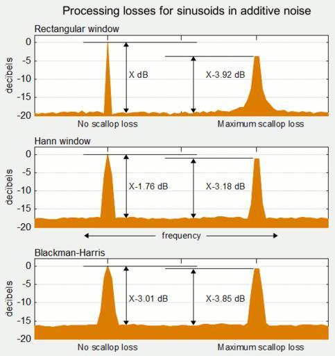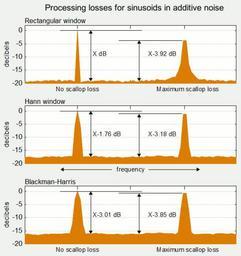 | Keywords: Processing losses for 3 window functions.gif en Comparison of three window functions in terms of their effects on equal-strength sinusoids with additive noise The noise floor is smoothed by averaging many DFTs to reveal the substantial difference in levels caused by the different window functions In each case the sinusoid on the left suffers no scalloping and the one on the right exhibits worst-case scalloping The rectangular window produces the most scalloping but lowest noise-floor The Hann window has a higher noise floor but much less potential scalloping which results in the lowest worst case processing loss of these 3 functions 2013-02-25 10 16 32 own Bob K Octave script <source lang Matlab > graphics_toolkit gnuplot N 256; sams_per_fft; window1 rectwin N '/sum rectwin N ; window2 hann N '/sum hann N ; window3 blackmanharris N /sum blackmanharris N ; Fs N; sams_per_sec; HzPerBin Fs/N; F1 -20 0 HzPerBin; bin -20 F2 +20 5 HzPerBin; bin 20 5 L 100000; n 1 L; x exp j 2 pi F1/Fs n + exp j 2 pi F2/Fs n ; x x + randn 1 L +j randn 1 L 1 4; sams_per_offset 0 75 N; overlap 25 number of samples available beyond just one FFT excess_sams length x - N; j1 floor excess_sams / sams_per_offset ; sams_per_offset floor excess_sams / j1 ; num_ffts 1 + j1; define the first block of data samples 1 N; amplitude1 zeros 1 N ; amplitude2 zeros 1 N ; amplitude3 zeros 1 N ; Loop over all the available blocks for j1 1 num_ffts amplitude1 amplitude1 + abs fft x samples window1 ; amplitude2 amplitude2 + abs fft x samples window2 ; amplitude3 amplitude3 + abs fft x samples window3 ; samples samples + sams_per_offset; end amplitude1 20 log10 fftshift amplitude1/num_ffts ; amplitude2 20 log10 fftshift amplitude2/num_ffts ; amplitude3 20 log10 fftshift amplitude3/num_ffts ; abscissa -40 40; figure 1 'color' 95 1 1 1 set gca 'FontSize' 8 subplot 3 1 1 ; h area abscissa amplitude1 abscissa +N/2+1 'FaceColor' 871 49 0 'edgecolor' 871 49 0 ; set h 'BaseValue' -20 set gca 'XTick' -20 0 20 5 'XTickLabel' ' '; ' '; ' ' 'YGrid' 'on' 'color' 'white' title 'Processing losses for sinusoids in additive noise' 'fontsize' 12 ; xlim -40 40 ylim -20 2 ylabel 'decibels' text -40 3 5 'Rectangular window' subplot 3 1 2 ; h area abscissa amplitude2 abscissa +N/2+1 'FaceColor' 871 49 0 'edgecolor' 871 49 0 ; set h 'BaseValue' -20 set gca 'XTick' -20 0 20 5 'XTickLabel' ' '; ' '; ' ' 'YGrid' 'on' 'color' 'white' xlim -40 40 ylim -20 2 ylabel 'decibels' text -40 3 5 'Hann window' subplot 3 1 3 ; h area abscissa amplitude3 abscissa +N/2+1 'FaceColor' 871 49 0 'edgecolor' 871 49 0 ; set h 'BaseValue' -20 set gca 'XTick' -20 0 20 5 'XTickLabel' ' '; ' '; ' ' 'YGrid' 'on' 'color' 'white' xlim -40 40 ylim -20 2 ylabel 'decibels' text -40 3 5 'Blackman-Harris' </source> cc-zero Uploaded with UploadWizard Window function Created with GNU Octave |