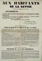 | Keywords: Proclamation-VictorEmmanuel1860.jpg fr Aux habitants de la Savoie Traité de réunion de la Savoie et de Nice à la France Proclamation de S M le roi Victor-Emmanuel 24 mars 1860 «Cette affiche provient des archives départementales de la Savoie et du site Internet de Conseil général de la Savoie http //www savoie fr/archives73/expo_affiches_1814-1860/ Aux habitants de la Savoie annexion; Savoie; Chambéry Imprimeur de Puthod fils au Verney 1860 1860 PD-old PD-old Poster of Savoie | ||||