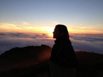 Keywords: profile woman yellow sunset fog clouds silhouette spiritual glow radiance dramatic horizon sky contrast black coast sun illumination luminous orange peaceful powerful