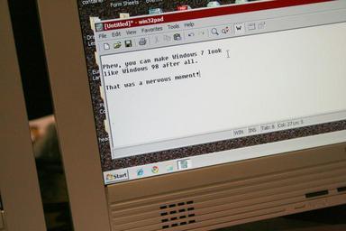 | Keywords: project 365 project365 retro windows 7 windows7 i liked 98 iliked98 configuration relief upgrading document text I'm sure that Keith will be shocked and stunned to learn that I've upgraded my operating system in work. I've jumped from XP to Windows 7, and I was pretty much forced by XP's reluctance to address my RAM and make the most of the multi core CPU. The installation wasn't too bad, but I did have some nervous moments wading through all the pointless glass and aero effects. I needn't have worried. With an hour or two of carefully directed industry and a dedicated mind you can make Windows 7 look just like Windows 98! Phew, that was a close call! :) I'm sure that Keith will be shocked and stunned to learn that I've upgraded my operating system in work. I've jumped from XP to Windows 7, and I was pretty much forced by XP's reluctance to address my RAM and make the most of the multi core CPU. The installation wasn't too bad, but I did have some nervous moments wading through all the pointless glass and aero effects. I needn't have worried. With an hour or two of carefully directed industry and a dedicated mind you can make Windows 7 look just like Windows 98! Phew, that was a close call! :) |