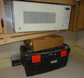| Keywords: Project to move cabinet and microwave 4 inches higher.JPG en The white microwave oven was about to be removed but first it was supported beneath by a toolbox and a box so when the screws were removed it did not fall down 2014-05-07 own Tomwsulcer cc-zero Uploaded with UploadWizard Microwave ovens Tool boxes Handyman photos by tom sulcer |