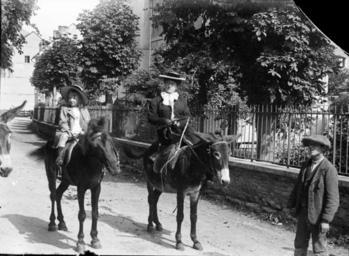 -- Femme -- Garçon -- Cheval -- Âne -- Rue -- Grille -- Jardin -- Costume féminin -- Costume d'enfant -- Chapeau -- Casquette -- Promenade -- Equestre