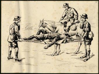 | Keywords: university of victoria universityofvictoria uvic great britain. army. royal regiment of artillery greatbritainarmyroyalregimentofartillery caricatures and cartoons--20th century caricaturesandcartoons20thcentury notebooks war artists warartists world war, 1914-1918--pictorial works worldwar19141918pictorialworks world war, 1914-1918--caricatures and cartoons worldwar19141918caricaturesandcartoons drawing sketch photo border cartoon surreal text illustration Item is one of 123 pen-and-ink drawings and watercolours from two volumes titled: "Sketches of the War: France/Belgium". The sketches vary from satirical cartoons to more detailed and naturalistic renditions. They are often accompanied by an ironic title and are often signed with the artist's initials, "J.M." The artist's satirical targets include the officers and high command of both combatant sides; the disjuncture between reported and actual events, and the death of civilians as a fact of modern warfare. Item is one of 123 pen-and-ink drawings and watercolours from two volumes titled: "Sketches of the War: France/Belgium". The sketches vary from satirical cartoons to more detailed and naturalistic renditions. They are often accompanied by an ironic title and are often signed with the artist's initials, "J.M." The artist's satirical targets include the officers and high command of both combatant sides; the disjuncture between reported and actual events, and the death of civilians as a fact of modern warfare. |