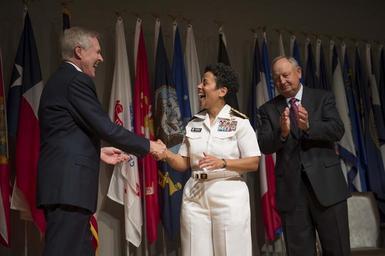 | Keywords: Promotion ceremony 140701-N-WL435-338.jpg en Secretary of the Navy Ray Mabus congratulates Adm Michelle Howard after putting on her fourth star Tuesday July 1 2014 during her promotion ceremony at the Women in Military Service for America Memorial Applauding Howard is her husband Wayne Cowles Howard is the first woman to be promoted to the rank of admiral in the history of the Navy and will assume the duties and responsibilities as the 38th Vice Chief of Naval Operations from Adm Mark Ferguson U S Navy photo by Chief Mass Communication Specialist Peter D Lawlor/Released 2014-07-01 Petty Officer 1st Class Peter Lawlor https //www dvidshub net/image/1430993 140701-N-WL435-338 2014-07-01 22 52 WASHINGTON DC US PD-USGov-Military-Navy Mark E Ferguson III Ray Mabus Images from DoD uploaded by Fæ |