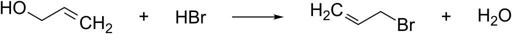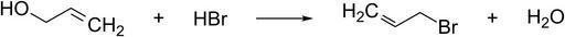 Keywords: Prop-2-en-1-ol to 3-bromoprop-1-ene.svg Reaction of prop-2-en-1-ol + hydrogen bromide to 3-bromoprop-1-ene Own 2014-02-19 Emeldir <span class signature-talk >talk</span> PD-chem Reactions of alcohols Reactions of hydrogen bromide