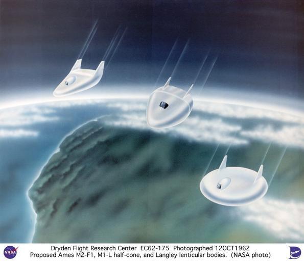 | Keywords: Proposed Ames M2-F1, M1-L half-cone, and Langley lenticular bodies. DVIDS688357.jpg en Dale Reed who inaugurated the lifting-body flight research at NASA's Flight Research Center later Dryden Flight Research Center Edwards CA originally proposed that three wooden outer shells be built These would then be attached to the single internal steel structure The three shapes were viewer's left to right the M2-F1 the M1-L and a lenticular shape Milt Thompson who supported Reed's advocacy for a lifting-body research project recommended that only the M2-F1 shell be built believing that the M1-L shape was too radical while the lenticular one was too exotic Although the lenticular shape was often likened to that of a flying saucer Reed's wife Donna called it the powder puff The wingless lifting body aircraft design was initially conceived as a means of landing an aircraft horizontally after atmospheric reentry The absence of wings would make the extreme heat of re-entry less damaging to the vehicle In 1962 Dryden management approved a program to build a lightweight unpowered lifting body as a prototype to flight test the wingless concept It would look like a flying bathtub and was designated the M2-F1 the M referring to manned and F referring to flight version It featured a plywood shell placed over a tubular steel frame crafted at Dryden Construction was completed in 1963 The first flight tests of the M2-F1 were over Rogers Dry Lake at the end of a tow rope attached to a hopped-up Pontiac convertible driven at speeds up to about 120 mph This vehicle needed to be able to tow the M2-F1 on the Rogers Dry Lakebed adjacent to NASA's Flight Research Center FRC at a minimum speed of 100 miles per hour To do that it had to handle the 400-pound pull of the M2-F1 Walter Whitey Whiteside who was a retired Air Force maintenance officer working in the FRC's Flight Operations Division was a dirt-bike rider and hot-rodder Together with Boyden Bud Bearce in the Procurement and Supply Branch of the FRC Whitey acquired a Pontiac Catalina convertible with the largest engine available He took the car to Bill Straup's renowned hot-rod shop near Long Beach for modification With a special gearbox and racing slicks the Pontiac could tow the 1 000-pound M2-F1 110 miles per hour in 30 seconds It proved adequate for the roughly 400 car tows that got the M2-F1 airborne to prove it could fly safely and to train pilots before they were towed behind a C-47 aircraft and released These initial car-tow tests produced enough flight data about the M2-F1 to proceed with flights behind the C-47 tow plane at greater altitudes The C-47 took the craft to an altitude of 12 000 where free flights back to Rogers Dry Lake began Pilot for the first series of flights of the M2-F1 was NASA research pilot Milt Thompson Typical glide flights with the M2-F1 lasted about two minutes and reached speeds of 110 to l20 mph A small solid landing rocket referred to as the instant L/D rocket was installed in the rear base of the M2-F1 This rocket which could be ignited by the pilot provided about 250 pounds of thrust for about 10 seconds The rocket could be used to extend the flight time near landing if needed More than 400 ground tows and 77 aircraft tow flights were carried out with the M2-F1 The success of Dryden's M2-F1 program led to NASA's development and construction of two heavyweight lifting bodies based on studies at NASA's Ames and Langley research centers--the M2-F2 and the HL-10 both built by the Northrop Corporation and the U S Air Force's X-24 program with an X-24A and -B built by Martin The Lifting Body program also heavily influenced the Space Shuttle program The M2-F1 program demonstrated the feasibility of the lifting body concept for horizontal landings of atmospheric entry vehicles It also demonstrated a procurement and management concept for prototype flight test vehicles that produced rapid results at very low cost approximately 50 000 excluding salaries of government employees assigned to the project NASA Identifier NIX-EC62-175 2009-09-23 Glenn Research Center https //www dvidshub net/image/688357 688357 2012-10-10 11 54 WASHINGTON DC US PD-USGov Langley Research Center Images from DoD uploaded by Fæ |