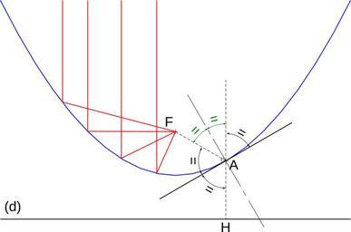 | Keywords: Propriete reflexion parabole-tangente bissectrice.svg en The reflection property of a parabolic mirror is explained by a geometrical property of the parabolas the tangent at a point A is the bisecting line of the angle FAH fr La propriété de réflexion d'un miroir parabolique est expliquée par une propriété géométrique de sparaboles la tangente en un point A est la bissectrice de l'angle FAH own 2014-03-12 Christophe Dang Ngoc Chan Cdang <span class signature-talk >talk</span> inkscape cdang Parabolas Concave mirror diagrams Cc-zero |