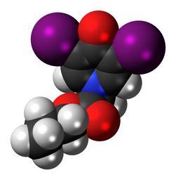 | Keywords: Propyliodone-3D-spacefill.png Space-filling model of the propyliodone molecule an X-ray contrast agent Colour code 505050 Carbon C black<br> F0F0F0 Hydrogen H white<br> F51E1E Oxygen O red<br> 3C50FA Nitrogen N blue<br> 961496 Iodine I purple<br> 2011-02-03 own DS Visualizer Jynto talk Ball-and-stick version cc-zero Iodine containing contrast agents Dihydroazines Cyclic ketones Carboxylate esters Propyl esters Images by Jynto | ||||