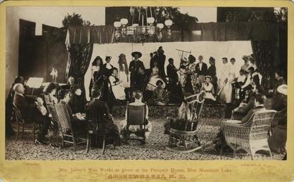 | Keywords: Prospect House in Blue Mountain Lake, New Yorkjpg.jpg The image shows men and women posed on a makeshift stage in the parlour of the Prospect House in Blue Mountain Lake New York A number of well-dressed men and women sit in chairs facing the stage The hotel's chandelier hangs in front of the valance curtain Prospect House was situated at the foot of Blue Mountain on a point of land jutting out into Blue Mountain Lake The six-story 300-room Prospect House opened in 1882 It had many modern conveniences that other hotels in the area did not have such as a steam-powered elevator http //postalpicture blogspot com br/2012/01/on-with-show html ~ 1882 Creator Albert Bierstadt PD-old-100 Albert Bierstadt |