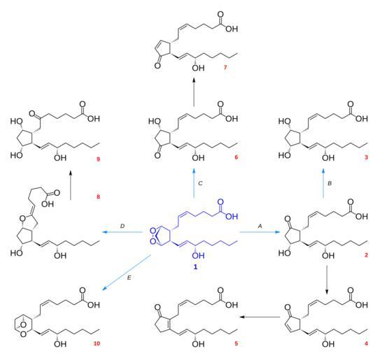 | Keywords: Prostanoid synthesis numbered.svg Schematic diagram of w prostanoid synthesis from prostaglandin H<sub>2</sub> Created with http //www acdlabs com/download/chemsk html ACD/ChemSketch 10 0 and Inkscape Created with Inkscape ;Legend blue Parent compound w prostaglandin H<sub>2</sub> red Daughter compounds lightblue w Enzyme -mediated reaction Enzyme<br> Prostanoid compound ;Compounds depicted Prostaglandin H<sub>2</sub> Prostaglandin E<sub>2</sub> Prostaglandin F<sub>2</sub> Prostaglandin A<sub>2</sub> Prostaglandin B<sub>2</sub> Prostaglandin D<sub>2</sub> Prostaglandin J<sub>2</sub> Prostaglandin I<sub>2</sub> prostacyclin 6-keto-prostaglandin Fα Thromboxane A<sub>2</sub> ;Enzymes depicted A Prostaglandin E synthase B Prostaglandin E 9-ketoreductase C Prostaglandin D synthase D Prostacyclin synthase E Thromboxane-A synthase Own work based on information from http //www lipidlibrary co uk/Lipids/eicprost/index htm the Lipid Library and Image Eicosanoid synthesis png by JFW <br>Made by author upon request by David Throop on the Image Request page of the English Wikipedia's Chemistry Project 2007-11-03 Fvasconcellos thumb left English versionthumb center Unlabeled version Biosyntheses Eicosanoids Organic syntheses |