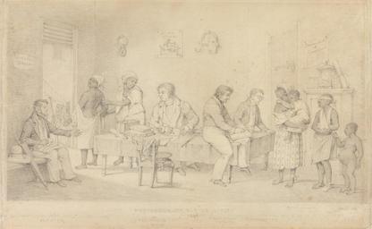 | Keywords: Protector of Slaves Office (Trinidad) by Richard Bridgens.jpg en Protector of Slaves Office Trinidad by Richard Bridgens active 1838 graphite on wove paper 8 in x 12 3/4 in 20 3 cm x 32 4 cm Courtesy of the Paul Mellon Collection Yale Center for British Art Yale University New Haven Connecticut ~ 1833 Yale Center for British Art http //collections britishart yale edu/vufind/Record/3645666 Richard Bridgens PD-Art History of Trinidad Slavery Slaves in art Slave trade in art 1830s drawings |