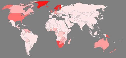 | Keywords: Protestentism world map.png Prevalence of protestantism by country Countries with 16 or more protestants are marked The scale is HSV 0/P/100 where P is the percentage of Protestants E g Denmark 0/91/100 RGB ff1717 USA 0/55/100 RGB ff7373 Data is based on the US State Department's International Religious Freedom Report 2004 adherents com and the CIA Factbook via this image which only lists the 60 countries with the highest percentage of protestants Rank 60 is Haiti with 16 All other countries with a fraction lower than that of Haiti are shown with a generic background colour fo HSV 0/10/100 ffe6e6 These countries could be given better resolution in future updates of the map ff1919 90 ff3333 80 ff4d4d 70 ff6666 60 ff8080 50 ff9999 40 ffb3b3 30 ffcccc 20 ffe6e6 15 or less Protestentism_By_Country_Percent png 2011-03-10 14 33 UTC Protestentism_By_Country_Percent png User Electionworld derivative work Dbachmann <span class signature-talk >talk</span> Sliding scale HSV palette Dbachmann Protestentism_By_Country_Percent png Original upload log This image is a derivative work of the following images File Protestentism_By_Country_Percent png licensed with PD-user 2006-12-04T19 38 15Z Electionworld 1357x628 96311 Bytes <nowiki> en ThrashedParanoid Based on US State Department's International Religious Freedom Report 2004 Adherents com and the CIA Factbook Licensing ThrashedParanoid Categor</nowiki> Protestant distribution maps of the world Maps needing South Sudan political boundaries |