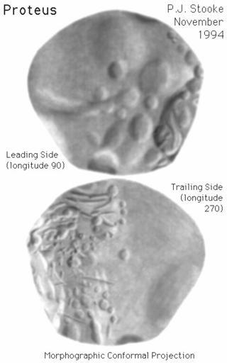 | Keywords: Proteus map (Stooke).jpg Original caption SHADED RELIEF MAP OF PROTEUShttp //publish uwo ca/~pjstooke/proteus txt Proteus gif is a shaded relief map of Proteus a small inner satellite of Neptune As with all maps it is the cartographer's interpretation and not all features are necessarily certain given the limited data available - this interpretation stretches the data as far as is feasible The original map was published in its full form with latitude-longitude grid and feature names in Stooke P J 1994 The Surfaces of Larissa and Proteus EARTH MOON AND PLANETS V 65 pp 31-54 Positions in the map are controlled by a digital shape model described in that paper For this map the three dimensional convex hull of the shape model was projected into the Morphographic Conformal Projection the conventional Stereographic Projection modified for non-spherical worlds The leading side longitude 90 runs vertically down the centre faces forwards in the orbit of Proteus The trailing side longitude 270 runs vertically down its centre faces backwards along the orbit Longitude 0 is at the righthand end of the leading side and faces Neptune As with all conformal true shape projections the scale in these maps varies increasing from the centre to the outer edge The map projection is described in Stooke P J and Keller C P 1990 Map Projections for Non-Spherical Worlds / the Variable-Radius Map Projections CARTOGRAPHICA V 27 No 2 pp 82-100 This version of the file with labels intact is in the public domain Philip Stooke Department of Geography University of Western Ontario London Ontario Canada N6A 5C2 stooke sscl uwo ca Stooke P J 1994 The Surfaces of Larissa and Proteus EARTH MOON AND PLANETS V 65 pp 31-54 1994 Stooke P J Stooke P J Original upload log en wikipedia Proteus_map_ 28Stooke 29 jpg 2006-01-05 22 48 Kwamikagami 400×640× 47753 bytes <nowiki>;Original caption SHADED RELIEF MAP OF PROTEUShttp //publish uwo ca/~pjstooke/proteus txt Proteus gif is a shaded relief map of Proteus a small inner satellite of Neptune As with all maps it is the cartographer's interpretation and not all feature</nowiki> Proteus moon |