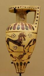 | Keywords: Protocorinthian aryballos Louvre CA2919.jpg Upper band galloping horses; lower band owl Protocorinthian aryballos ca 630 BC From Corinth Frise supérieure chevaux au galop ; frise supérieure chouette Aryballe protocorinthien vers 630 av J -C Provenance Corinthe ca 630 BC terracotta cm 8 2 3 3 Institution Louvre object department Greek Etruscan and Roman antiquities room ID 27 6205 object history credit line ProvenanceEvent bequest Gustave Schlumberger 1931 accession number CA 2919 own photo date 2006 Marie-Lan Nguyen artwork license PD-old-100 photo license other versions Horses in ancient Greek pottery Owls in ancient Greek pottery Ancient Greek pottery aryballoi Protocorinthian pottery Greek antiquities in the Louvre - Room 40 630s BC |