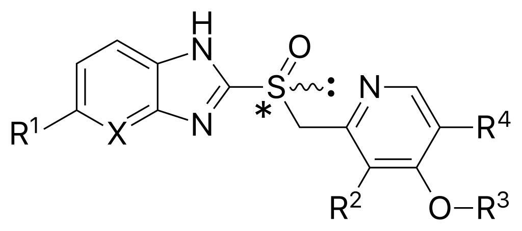 | Keywords: Proton pump inhibitors structure.svg proton pump inhibitor s Asterisk indicates stereocenter Dots indicate lone pair own Anypodetos 2012-02-07 pd-chem wikitable style margin 1em auto 1em auto; - rowspan 2 Compound colspan 5 Substituents rowspan 2 Form rowspan 2 Cysteine binding colspan 2 pK<sub>a</sub> First approval - X R<sup>1</sup> R<sup>2</sup> R<sup>3</sup> R<sup>4</sup> pKa<sub>a1</sub> pKa<sub>a1</sub> year - Omeprazole CH OCH<sub>3</sub> CH<sub>3</sub> CH<sub>3</sub> CH<sub>3</sub> Racemic mixture 813 and 892 4 06 0 79 1989 in USA - Esomeprazole CH OCH<sub>3</sub> CH<sub>3</sub> CH<sub>3</sub> CH<sub>3</sub> S - ˆ’ -enantiomer of lansoprazole 813 and 892 4 06 0 79 2001 in USA - Lansoprazole CH H CH<sub>3</sub> CH<sub>2</sub>CF<sub>3</sub> H Racemic mixture 813 and 321 3 83 0 62 1991 in Europe - Dexlansoprazole CH H CH<sub>3</sub> CH<sub>2</sub>CF<sub>3</sub> H R - + -enantiomer of lansoprazole 813 and 321 3 83 0 62 2009 in USA - Pantoprazole CH OCHF<sub>2</sub> OCH<sub>3</sub> CH<sub>3</sub> H Racemic mixture 813 and 822 3 83 0 11 1994 in Germany - Rabeprazole CH H CH<sub>3</sub> CH<sub>2</sub> <sub>3</sub>OCH<sub>3</sub> H Racemic mixture 813 892 and 321 4 53 0 62 1999 in USA - Tenatoprazole N OCH<sub>3</sub> CH<sub>3</sub> CH<sub>3</sub> CH<sub>3</sub> Racemic mixture 813 and 822 4 04 “0 12 ” valid svg Cc-zero Proton pump inhibitors |