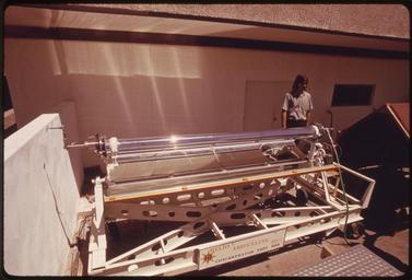 | Keywords: PROTOTYPE OF A LINEAR PARABOLIC REFLECTOR USED TO GATHER THE SUN'S ENERGY AND HEAT FLUID IN THE CENTER PIPE TO... - NARA - 555348.jpg Scope and content General notes 555348 Local identifier 412-DA-12896 Environmental Protection Agency 12/02/1970 - NARA-Author Norton Boyd 1936- Photographer 1111093 <br /> Tucson Pima county Arizona United States North and Central America inhabited place 4203211 32 217 -110 92 <br /> Still Picture Records Section Special Media Archives Services Division NWCS-S National Archives at College Park 8601 Adelphi Road College Park MD 20740-6001 04/1974 Record group Record Group 412 Records of the Environmental Protection Agency 1944 - 2006 Record group ARC 708 DOCUMERICA The Environmental Protection Agency's Program to Photographically Document Subjects of Environmental Concern compiled 1972 - 1977 Series ARC 542493 File unit File unit ARC Variant control numbers Agency-Assigned Identifier 215/56/012896<br /> NAIL Control Number NWDNS-412-DA-12896 Other versions <gallery> File PROTOTYPE_OF_A_LINEAR_PARABOLIC_REFLECTOR_USED_TO_GATHER_THE_SUN'S_ENERGY_AND_HEAT_FLUID_IN_THE_CENTER_PIPE_TO _-_NARA_-_555348 tif tif File PROTOTYPE_OF_A_LINEAR_PARABOLIC_REFLECTOR_USED_TO_GATHER_THE_SUN'S_ENERGY_AND_HEAT_FLUID_IN_THE_CENTER_PIPE_TO _-_NARA_-_555348 jpg jpg </gallery> NARA-cooperation PD-USGov Solar energy in the United States |
