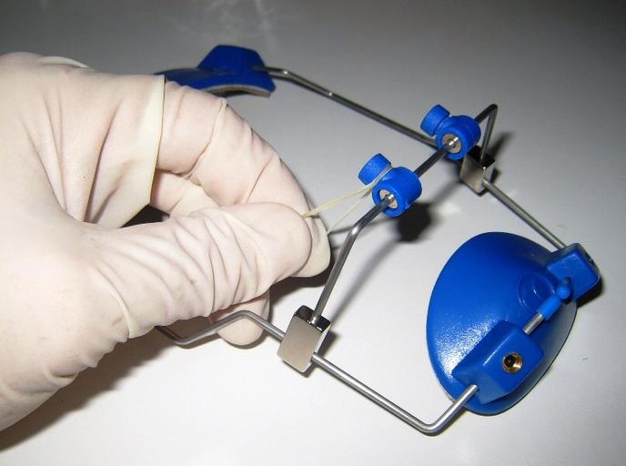 | Keywords: headgear braces teenage girls boys facemask Most patients with a maxillary deficiency (with an underbite) the use of a facemask for protraction of the jaw and maxilla is one of the most common treatment plans used today. The Delaire reverse pull facemask is unique because it requires no additional headcap or straps to hold the appliance to the patients head and it uses the direct force of the elastic bands into the child's or teenagers mouth, attached to the braces - this is using an intra-oral hook or a functional appliance, such as the Rapid Palatal Expander (RPE), to hold the mask or face frame in place during treatment. However it has been found that adding straps or a headcap improves stability of the appliance and in many cases elasticated Velcro straps are added. Most patients with a maxillary deficiency (with an underbite) the use of a facemask for protraction of the jaw and maxilla is one of the most common treatment plans used today. The Delaire reverse pull facemask is unique because it requires no additional headcap or straps to hold the appliance to the patients head and it uses the direct force of the elastic bands into the child's or teenagers mouth, attached to the braces - this is using an intra-oral hook or a functional appliance, such as the Rapid Palatal Expander (RPE), to hold the mask or face frame in place during treatment. However it has been found that adding straps or a headcap improves stability of the appliance and in many cases elasticated Velcro straps are added. |