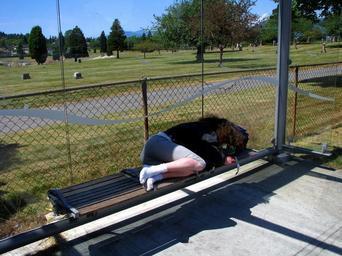 Keywords: Proximate Nap.jpg en Public sleeper in a bus shelter beside the Vancouver Municipal Cemetery; in Vancouver BC Canada own Name invalid 2008-07-09 Vancouver BC Canada Poverty in Vancouver