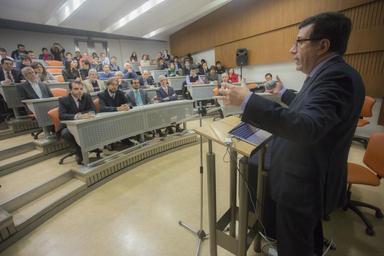 Keywords: indoor La Facultad de Ingeniería y Ciencias y la Escuela de Negocios, realizaron la presentación del proyecto CONICYT Anillo “Optimización a gran escala e incertidumbre: desafíos en planificación minera estratégica, un enfoque interdisciplinario” que agrupa a investigadores de distintas disciplinas y universidades: Universidad Adolfo Ibáñez, Universidad de Chile, Universidad Católica y Universidad Católica del Norte en torno al tema de la planificación minera estratégica. En el la oportunidad Manola Sánchez, decana Escuela de Negocios; y Alejandro Jadresic, decano Facultad de Ingeniería y Ciencias dieron la bienvenida a la ceremonia, en que destacaron los desafíos que supone este nuevo centro. Intervinieron además el subsecretario de Minería, Ignacio Moreno Fernández; el director Ejecutivo de CONICYT, Christian Nicolai; Joaquín Villarino, presidente Consejo Minero; José Pesce, vicepresidente de Gestión de Recursos mineros y Desarrollo de CODELCO. La presentación del Anillo fue realizada por Marcos Goycoolea, director del Proyecto Anillo "Desafíos en planificación minera estratégica: Un enfoque interdisciplinario". La Facultad de Ingeniería y Ciencias y la Escuela de Negocios, realizaron la presentación del proyecto CONICYT Anillo “Optimización a gran escala e incertidumbre: desafíos en planificación minera estratégica, un enfoque interdisciplinario” que agrupa a investigadores de distintas disciplinas y universidades: Universidad Adolfo Ibáñez, Universidad de Chile, Universidad Católica y Universidad Católica del Norte en torno al tema de la planificación minera estratégica. En el la oportunidad Manola Sánchez, decana Escuela de Negocios; y Alejandro Jadresic, decano Facultad de Ingeniería y Ciencias dieron la bienvenida a la ceremonia, en que destacaron los desafíos que supone este nuevo centro. Intervinieron además el subsecretario de Minería, Ignacio Moreno Fernández; el director Ejecutivo de CONICYT, Christian Nicolai; Joaquín Villarino, presidente Consejo Minero; José Pesce, vicepresidente de Gestión de Recursos mineros y Desarrollo de CODELCO. La presentación del Anillo fue realizada por Marcos Goycoolea, director del Proyecto Anillo "Desafíos en planificación minera estratégica: Un enfoque interdisciplinario".