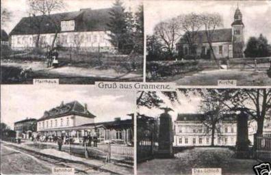 Keywords: Pruska pocztówka z Grzmiącej (Gramenz).jpg en post card from grzmiąca pl pocztówka prezentująca m in kościół dworzec kolejowy pałac Source Creator Grzmiąca województwo zachodniopomorskie PD-Art