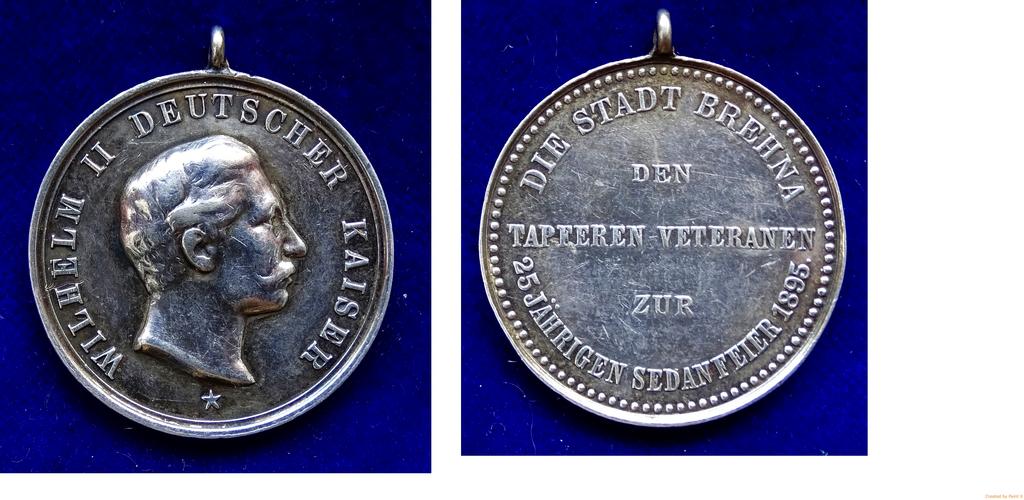 | Keywords: Prussian War Veteran Silver Medal Day of Sedan 1895.jpg en D 32 mm 11 41 g Ag Day of Sedan Sedantag was a semi-official memorial holiday in the German Empire celebrated on the second of September to commemorate the victory in the at Battle of Sedan 1870 After the outbreak of the Franco-Prussian War a few weeks later French emperor Napoleon III and his army were taken prisoner in the fortress of Sedan by Prussian troops a major step to eventual victory Wilhelm II Deutscher Kaiser 1888 - 1918 Head r around WILHELM II DEUTSCHER KAISER / 3 lines and around DIE STADT BREHNA DEN TAPFEREN VETERANEN ZUR 25 JÄHRIGEN SEDANFEIER 1895 Brehna is a small town now in Saxony-Anhalt Germany In 1895 it belonged to the Kingdom of Prussia Condition VERY FINE original loop 1895-09-02 own Berlin-George other versions cc-by-sa-4 0 This photo PD-1923 PD-EU-no author disclosure Wilhelm II of Germany on medals 1920 medals Medals of Germany Sedantag |