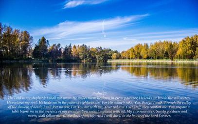 | Keywords: psalm 23 psalm23 the lord is my shepherd thelordismyshepherd god jesus jesus christ jesuschrist god the father godthefather holy spirit holyspirit holy church scripture angels faith prayer pray hope peace love alive forevermore aliveforevermore angel christian righteous king of kings kingofkings heaven archangel god is love godislove prince of peace princeofpeace creator christ the creator christthecreator god the creator godthecreator third heaven thirdheaven awesome alpha and omega alphaandomega wonderful glorious omnipotent almighty bible holy bible holybible armor of god armorofgod glorify hallelujah judgment judgment day judgmentday usa united states of america unitedstatesofamerica sleep christ who strengthens me christwhostrengthensme word of god wordofgod word of god stands forever wordofgodstandsforever eternity confess repent repentance humble sinner humble yourself humbleyourself saved lost found salvation praise god praisegod amen word became flesh wordbecameflesh be strong bestrong courage spiritual warfare outdoor landscape lake waterfront water serene New King James Version (NKJV) The Lord is my shepherd; I shall not want. He makes me to lie down in green pastures; He leads me beside the still waters. He restores my soul; He leads me in the paths of righteousness For His name’s sake. Yea, though I walk through the valley of the shadow of death, I will fear no evil; For You are with me; Your rod and Your staff, they comfort me. You prepare a table before me in the presence of my enemies; You anoint my head with oil; My cup runs over. Surely goodness and mercy shall follow me All the days of my life; And I will dwell in the house of the Lord Forever. Romans 8:28 New King James Version (NKJV) And we know that all things work together for good to those who love God, to those who are the called according to His purpose. New King James Version (NKJV) The Lord is my shepherd; I shall not want. He makes me to lie down in green pastures; He leads me beside the still waters. He restores my soul; He leads me in the paths of righteousness For His name’s sake. Yea, though I walk through the valley of the shadow of death, I will fear no evil; For You are with me; Your rod and Your staff, they comfort me. You prepare a table before me in the presence of my enemies; You anoint my head with oil; My cup runs over. Surely goodness and mercy shall follow me All the days of my life; And I will dwell in the house of the Lord Forever. Romans 8:28 New King James Version (NKJV) And we know that all things work together for good to those who love God, to those who are the called according to His purpose. |