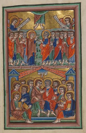 | Keywords: Psalterium Feriatum Cod Don 309 085.jpg Bild aus Psalterium Feriatum Hildesheim bald nach 1235 Württembergische Landesbibliothek Stuttgart Cod Don 309 http //digital wlb-stuttgart de/purl/bsz35289279X after 1235 anonymous PD-old-100 Psalterium Feriatum Cod Don 309 Miniatures of Ascension of Christ Miniatures of Pentecost Ascension with vanishing feet |