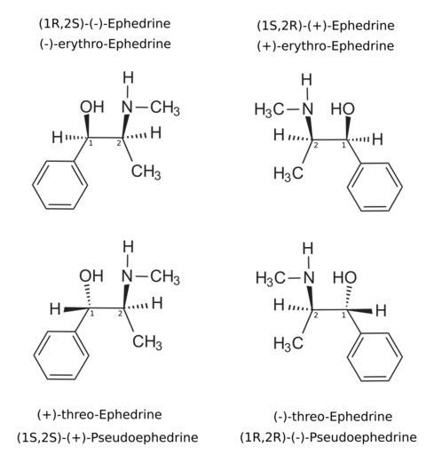 | Keywords: (pseudo)ephedrine enantiomers.svg  en The two pairs of enantiomers of ephedrine Top ephedrine<br> Bottom pseudoephedrine<br> IUPAC Name 2- methylamino -1-phenylpropan-1-ol The stereocenters are numbered own Wickey-nl 2009-12-15 Ephedrine Pseudoephedrine Inkscape validSVG |