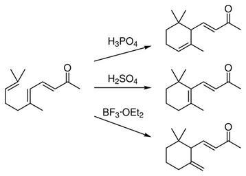 Keywords: Pseudoionone acid cyclization.svg Preparation of ionones by acid catalyzed cyclization of pseudoionone Own 2007-10-16 Calvero Orgenic syntheses Uncategorized 2015 March 20